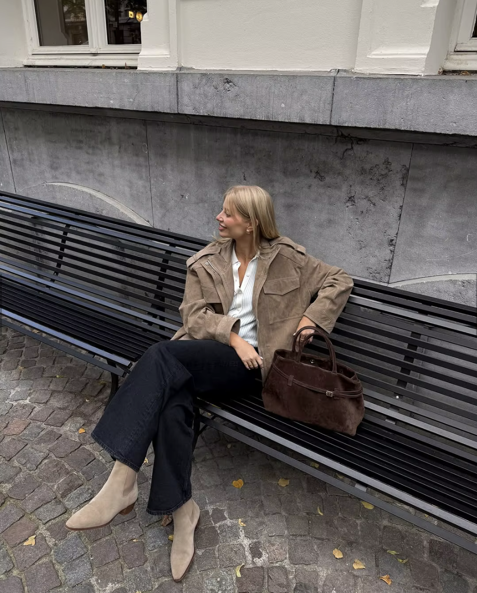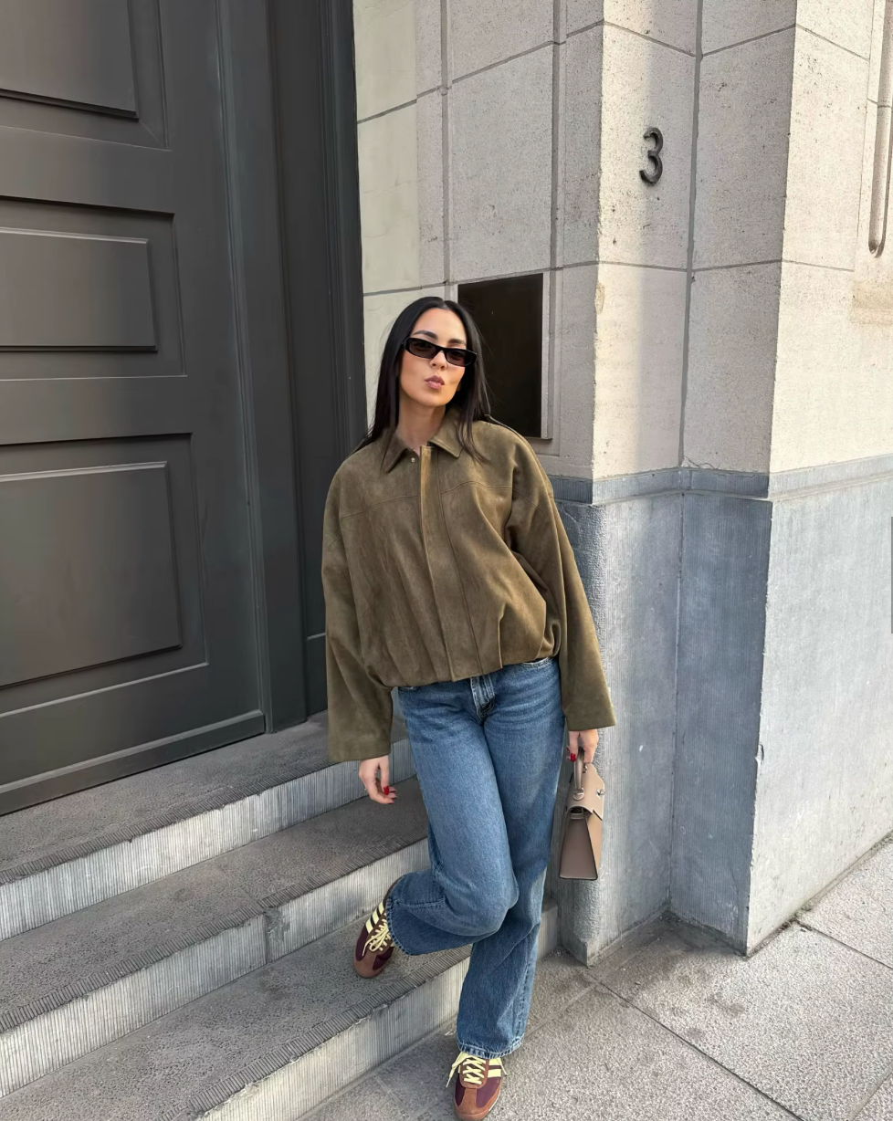 The jacket has an oversized fit. If you want a baggier look, stick to your normal size. For a more fitted style, size down.